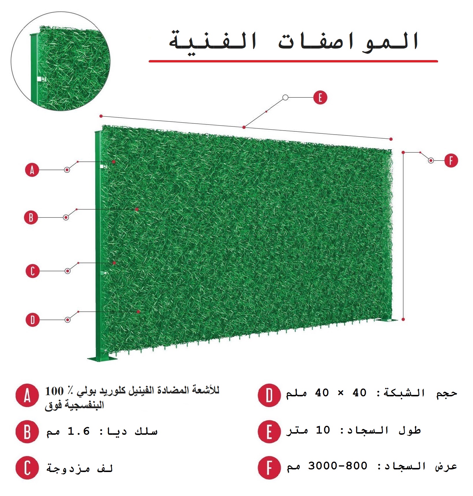 السور الأخضر عبارة عن عشب مصنوع من مادة PVC على أسلاك غير قابلة للصدأ. مقاومة للحريق ، يتلاشى ، ارتداء والسقوط. إذا لزم الأمر ، يمكن غسلها ولا تمتص الأصباغ. عند استخدامها مع الألواح على الأسطح بدون عناصر الدعم ، يمكن استخدام شبكة سلكية أو سطح جدار أو فجوات بين الوظائف كعنصر دعم. خصوصية السياج الأخضر هو أنه يمكن غسلها. وأنها لا تمتص الأصباغ. يمكن تركيبه بأي شكل وبأي حجم. باستخدام السياج الأخضر ، يمكنك تغطية جميع أنواع الواجهات والمباني والجدران بعشب اصطناعي. يتم إنجاز عملية مواجهة الجدران بسهولة عن طريق تثبيت الأسطوانة أو المبارزة الزخرفية على لوحات الحائط.